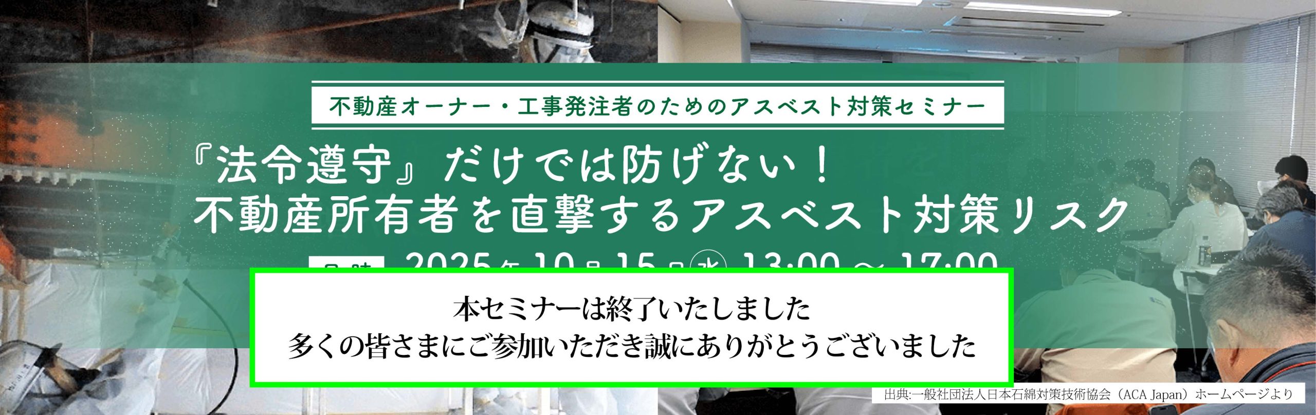アスベストによる被害を防ぐために、「新しい技術」や「商品の開発」を積極的に導入・普及させ、安心で安全な作業環境の改善と合理性向上を目指して発足した「未来アスベスト被害ゼロプロジェクト」が主催し、一般社団法人日本石綿対策技術協会(ACA Japan)が後援する、不動産所有者および工事発注者の皆さま向けセミナーを開催いたします。